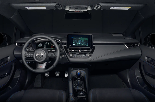 丰田卡罗拉GR限量版在内饰方面,延续了普通版车型的设计风格,仪表盘采用全液晶,中控屏幕的尺寸为12.3英寸,方向盘还增加了GR专属铭牌,一体式运动座椅为标配,座椅还增加了蓝色缝线,限量版车型还提供10安全气囊,JBL音响。