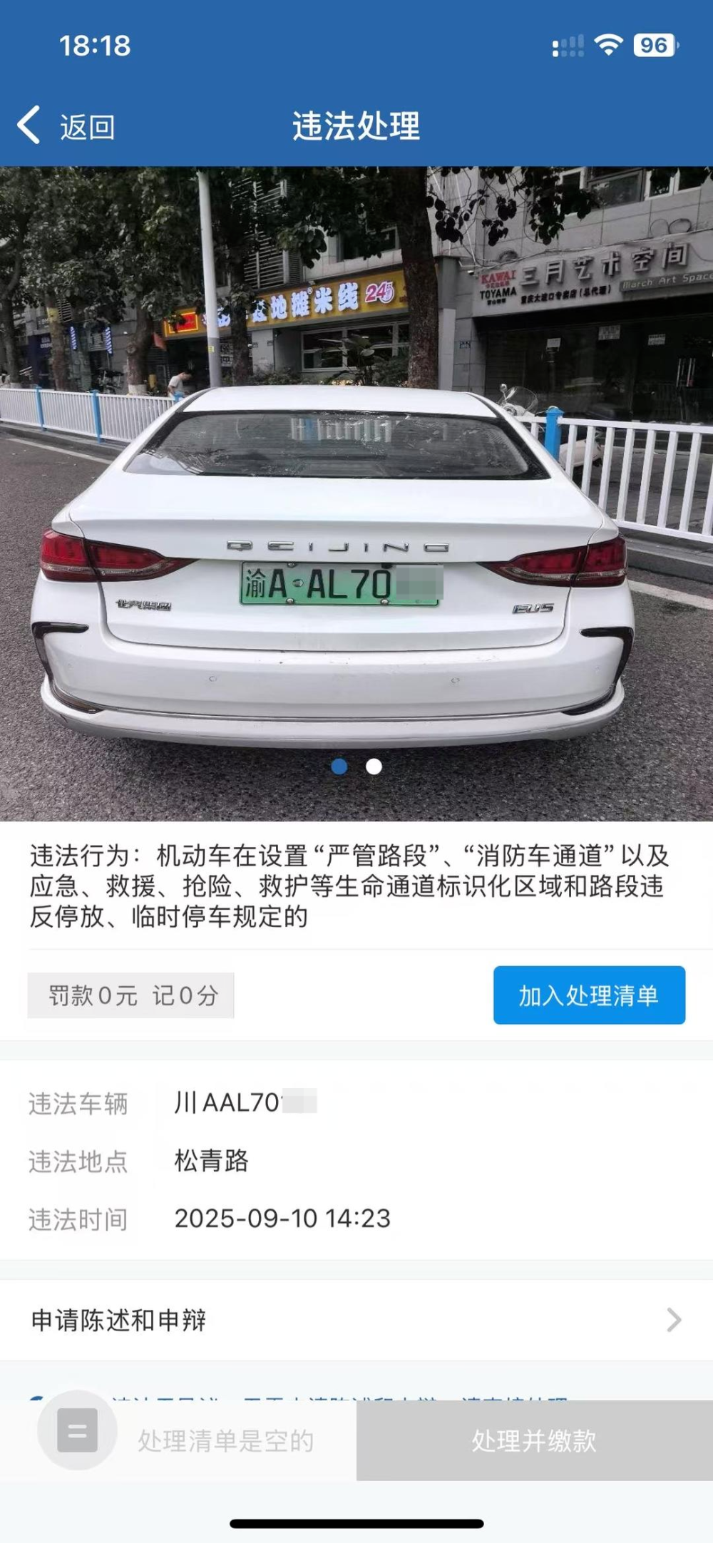 记者看到,处罚页面上的确有一辆白色车斜着停放在路旁,但李女士说这并不是自己的车,自己的车是绿色,只是车牌号和她的一样,“我的是川A,对方的是渝A,后面的数字字母都一样。”而且10日当天,自己的车好好停放在成都家中,不可能到了重庆,而且车也不一样。她随后进行申诉,但截至目前还未有结果。