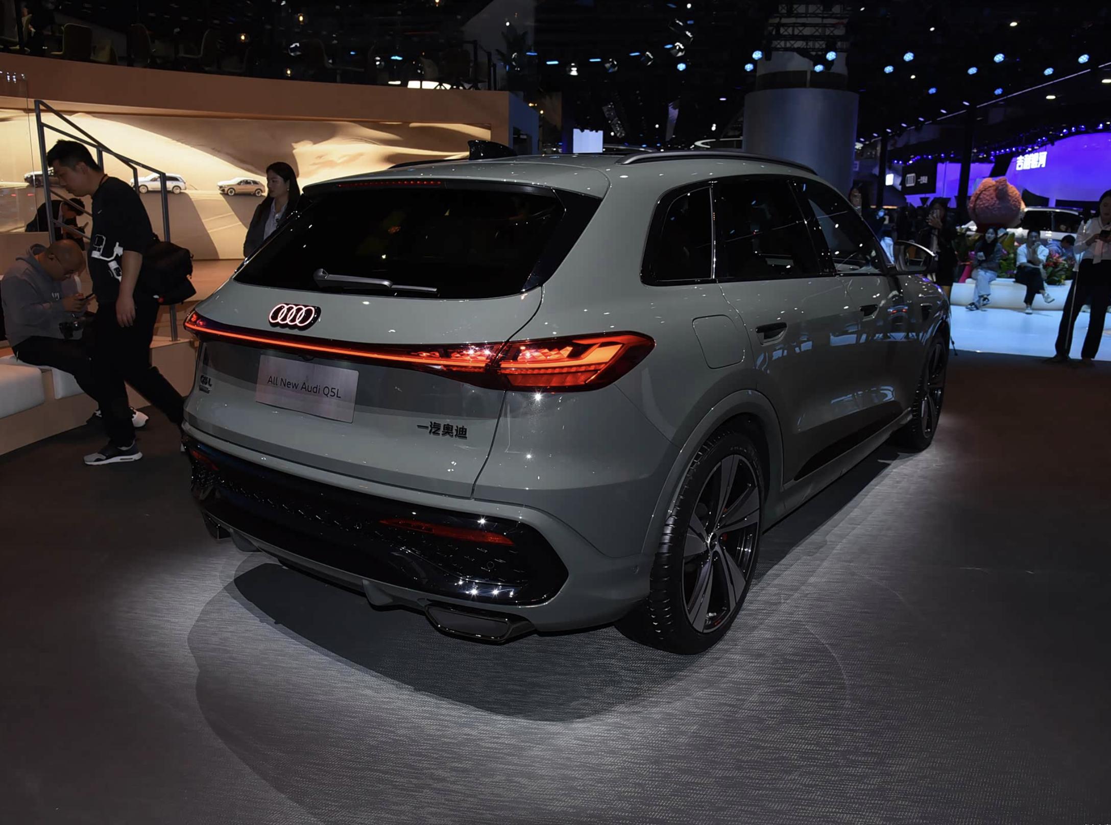 外观层面,全新奥迪Q5L车头依旧具有很高的辨识度,前舱盖两侧加入了隆起的型面,视觉效果更加立体,前脸配备了大尺寸六边形黑色格栅,两侧造型夸张的导流槽与横置式的进气口整合在了一起,最抓人眼球的还是前脸这一整套黑色蜂窝镂空中网,还有醒目的四个圈发光车标,以及两侧矩形的LED雾灯,造型犀利的前大灯加入了黑色的边框,内部融入了矩阵式LED光源,灯光秀更加酷炫,科技感十足。车尾更加饱满圆润,且富有层次感。向后延伸出的扰流板内置了横向排列的点阵式红色独立光源,贯穿式的尾灯内部融入了不断变幻的红色光带,再配上可发光的奥迪尾标,辨识度很高。黑色的底部扩散器搭配着两侧硕大的矩形排气尾喉,展现出十足的运动气息。